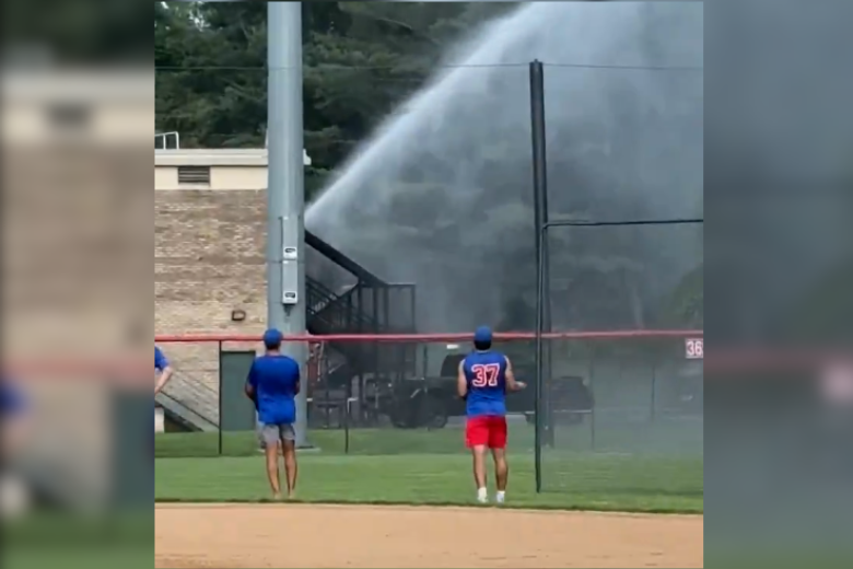 The incident reportedly stemmed from a baseball hit over the outfield fence during batting practice, which landed in the parking lot of nearby Fire Station 16 and damaged a volunteer firefighter’s pickup truck. In what appeared to be retaliation, a fire hose was used to douse the field with water.